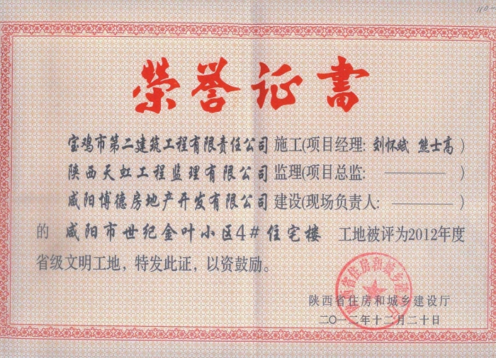 2012年度省級文明工地(世紀(jì)金葉小區(qū))