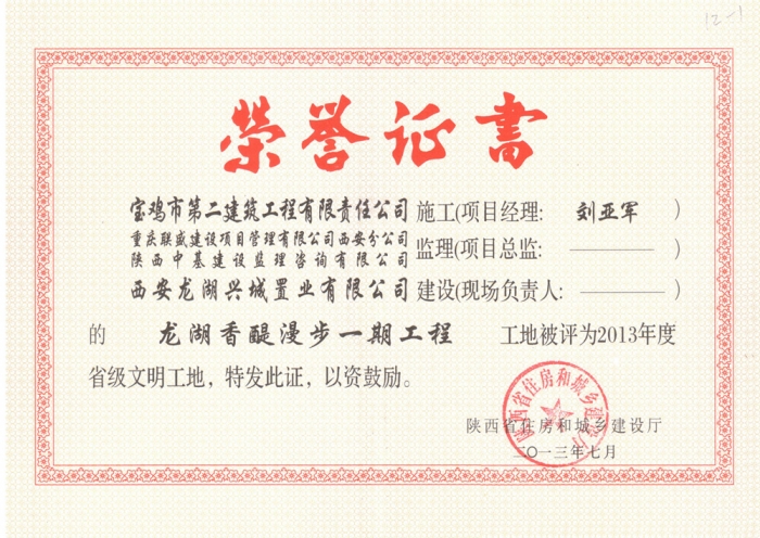 2013年省級(jí)省級(jí)文明工地(龍湖香醍漫步)